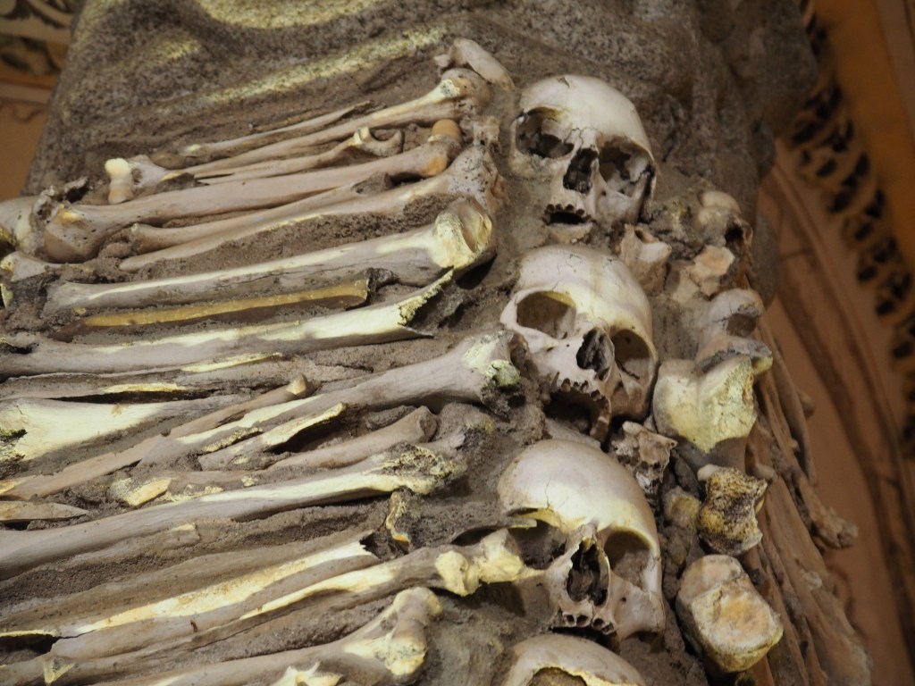 But when Brother Francisco holds the lamp up, it shines on skulls, so many skulls. As it lights up the the long thin shells the bones from arms and legs come into sharp relief. The crypt is decorated in human bones – every bit of it.